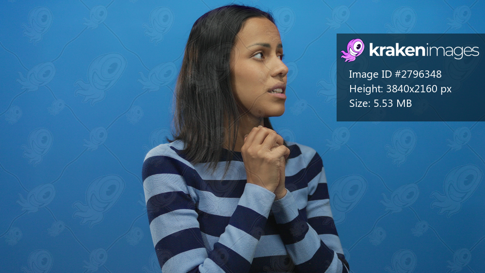 Woman wearing striped sweater stands pondering thoughtfully against an isolated blue background, expressing emotion with hands clasped together.
