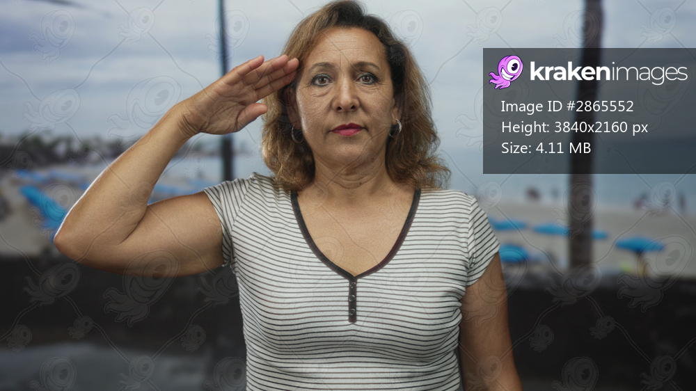 Woman wearing striped top and hoop earrings salutes with palm to forehead in front of building; serenity.