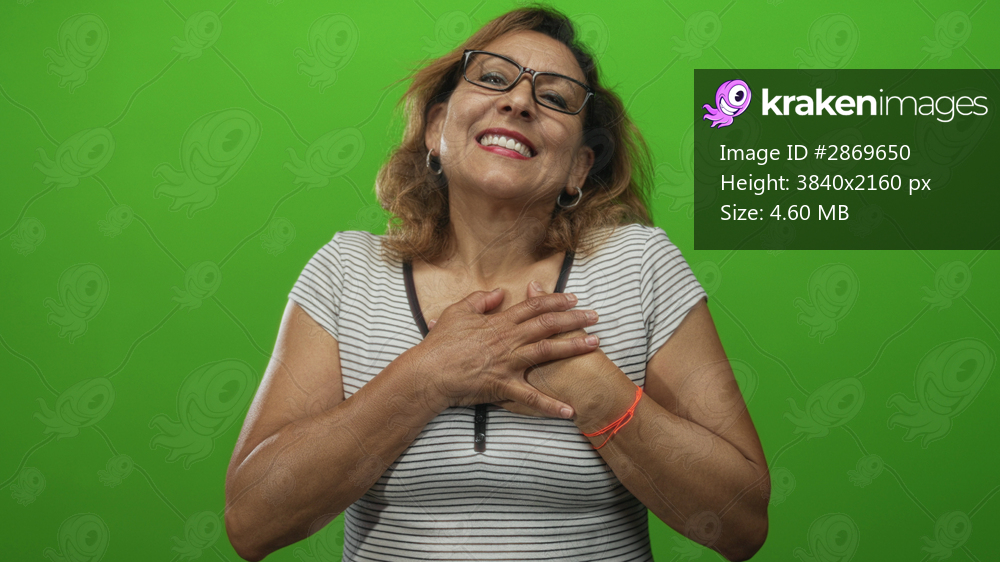 Woman wearing striped tshirt and glasses clutches chest with right hand in green studio setting; gratitude warmth.
