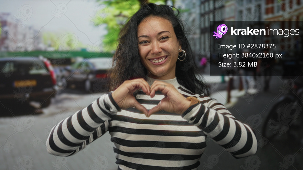 Woman wearing striped turtleneck makes heart gesture with hands in a busy city street, smiling and holding heart near face; joy love affection.