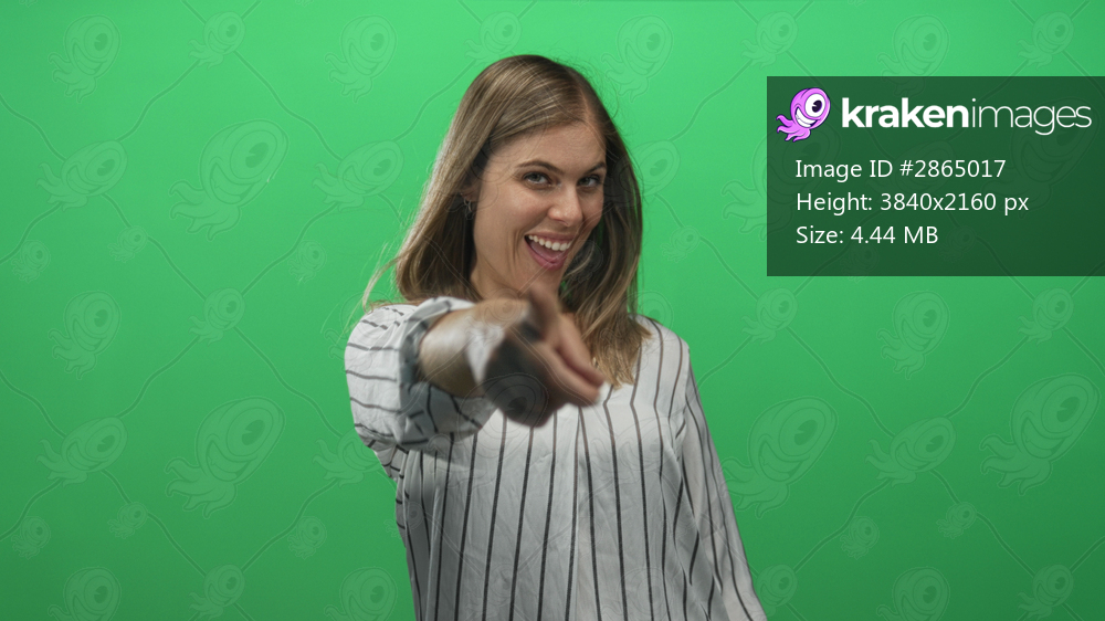 Woman wearing striped white blouse smiling broadly and pointing finger toward camera in studio; joy.
