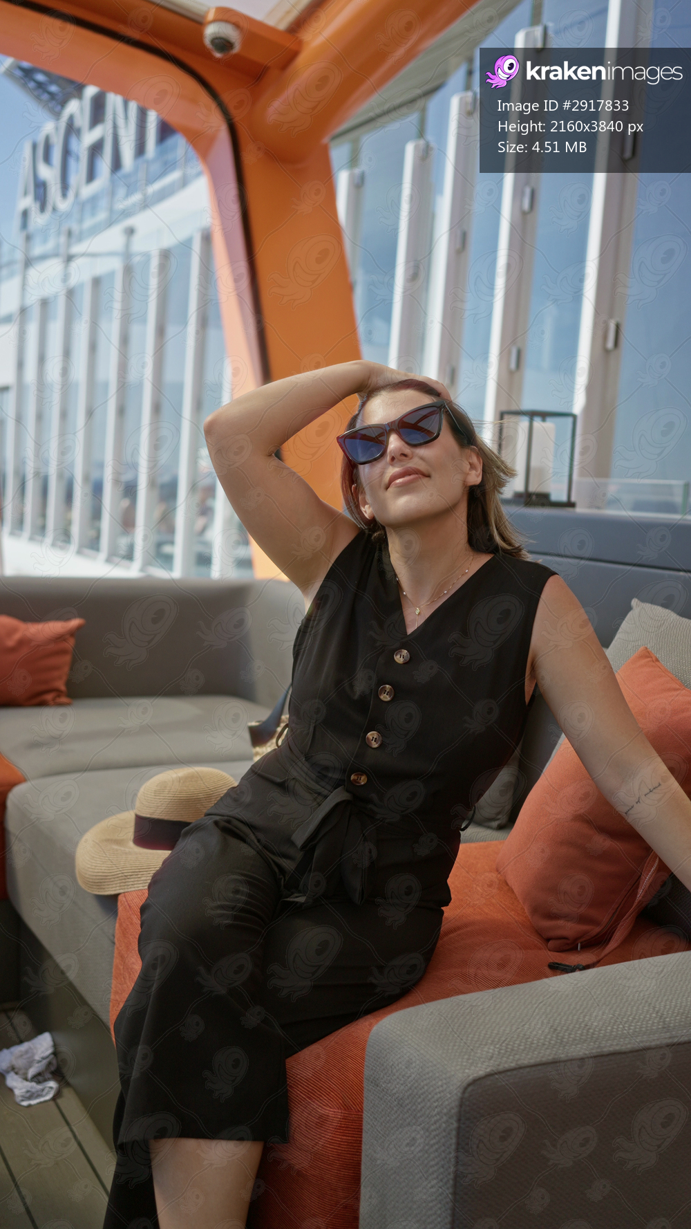 Woman wearing sunglasses with hand behind head sitting on orange sofa on the cruise terrace building; vacation calm.