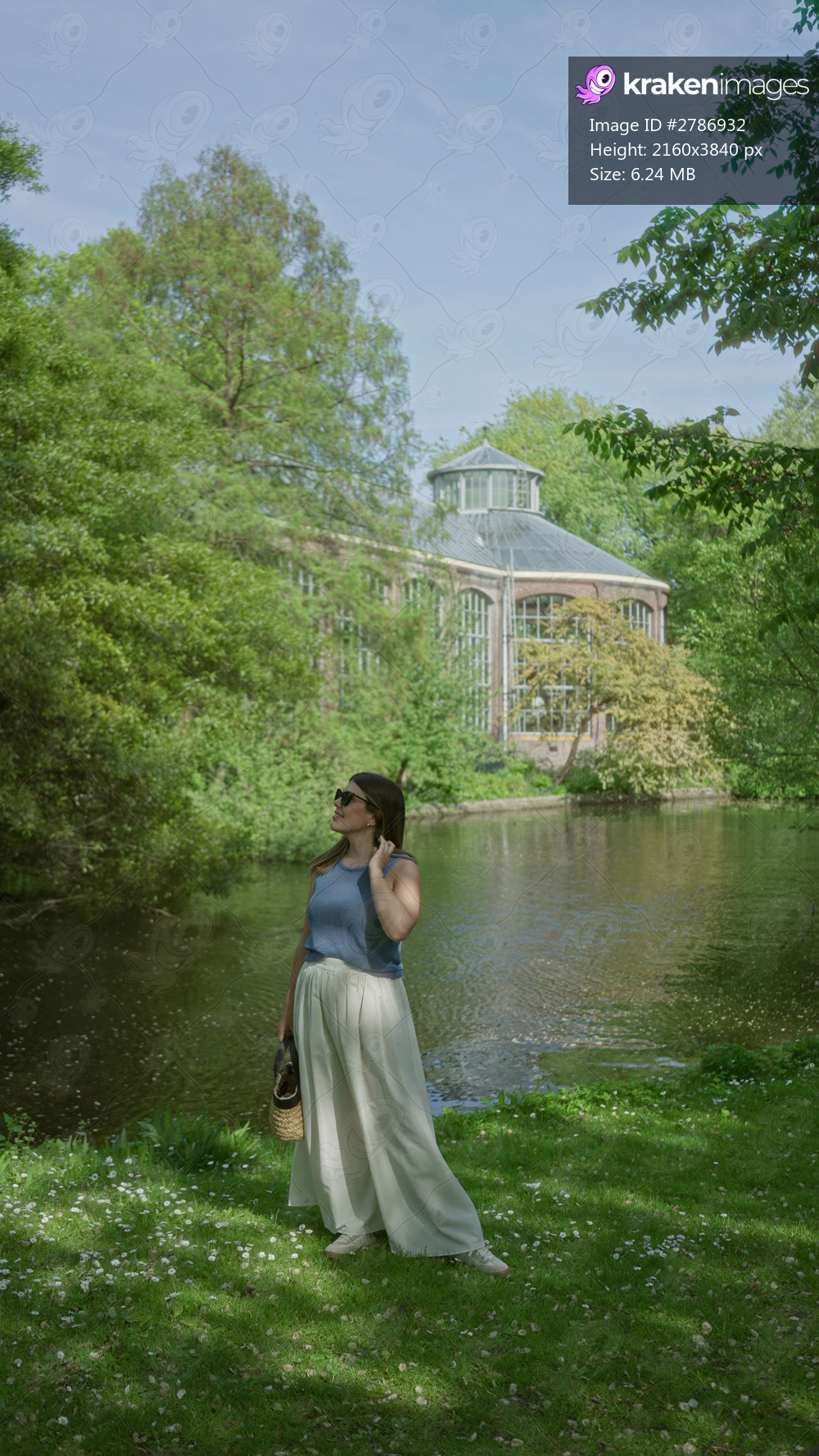 Woman wearing sunglasses in a lush garden near a pond with green trees and a glasshouse in the background