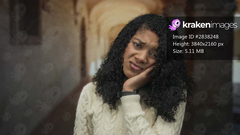 Woman wearing sweater hand on cheek for toothache in old town building with stone arches; discomfort.