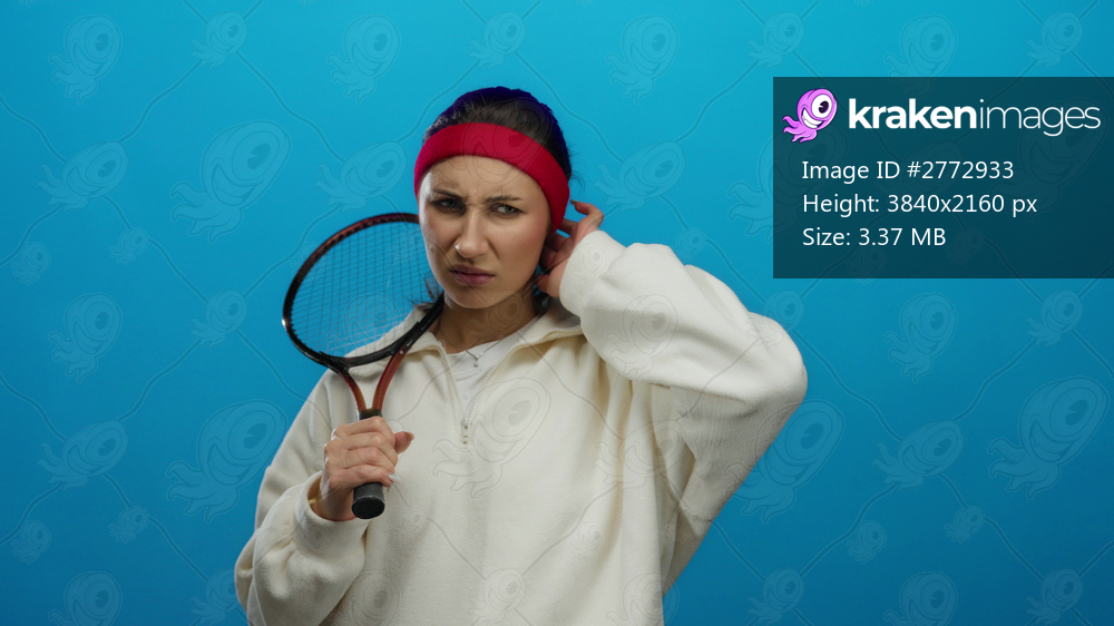 Woman wearing sweatshirt and red headband holds tennis racket against isolated blue background, expressing thoughtful emotion.