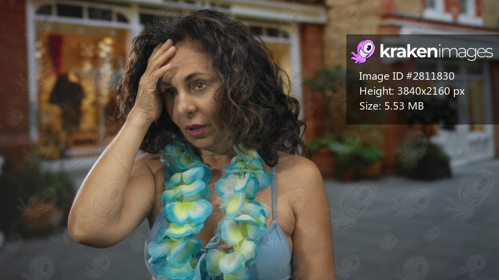Woman wearing swimsuit with hawaiian lei, standing outdoors on street looking thoughtful, middle-aged hispanic female in bikini setting urban scene summer attire. - Kraken Images