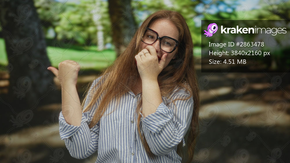 Woman wearing thick framed glasses and striped shirt with finger to lips for silence in sunny green park; playful.