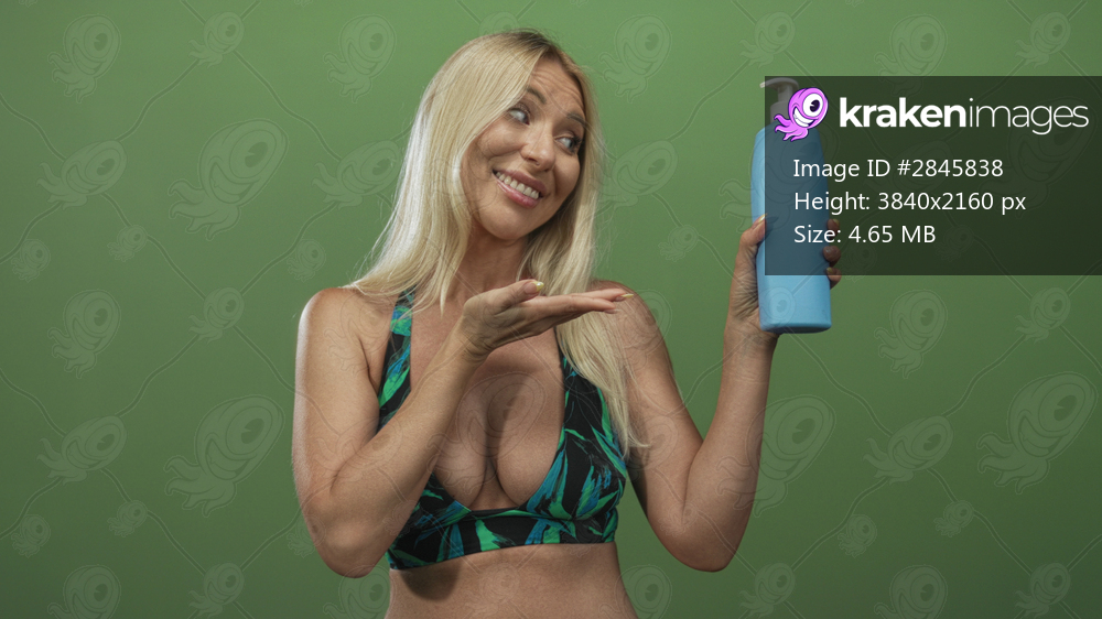 Woman wearing tropical bikini top points finger to blue lotion bottle in studio; health hydration confidence.