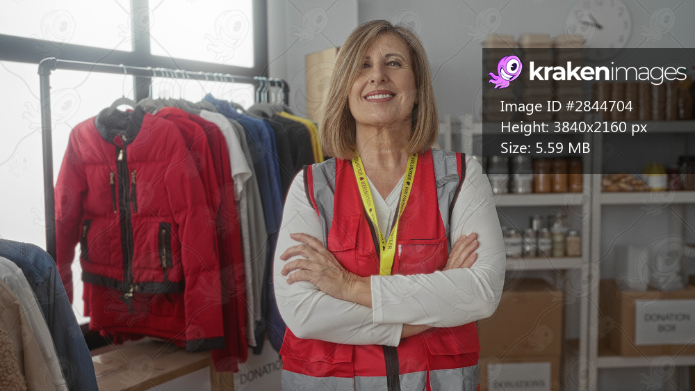 Woman wearing volunteer badge with arms crossed in donation building; compassion service charity help.