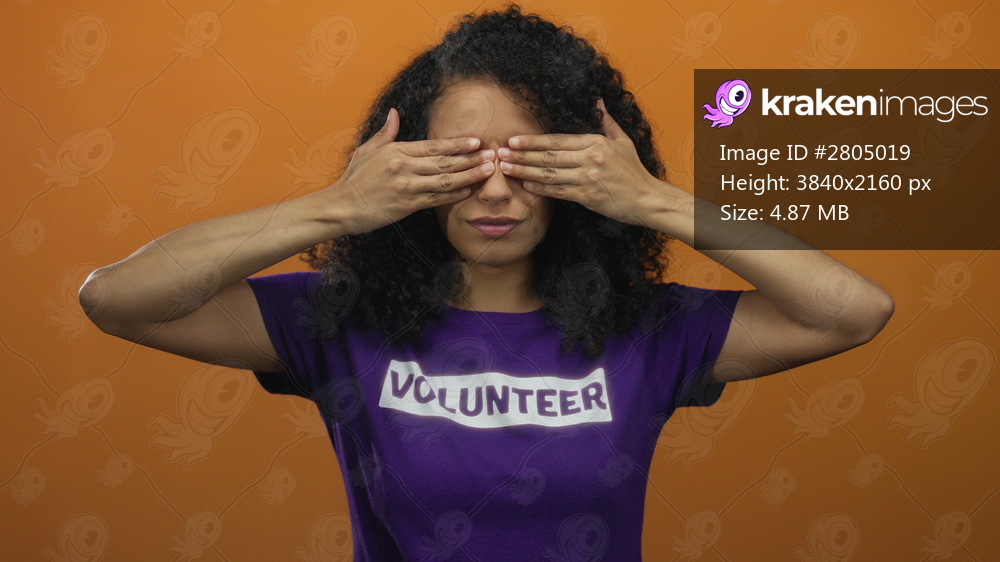 Woman wearing volunteer shirt covers eyes with hands in studio; community volunteerism support surprise.
