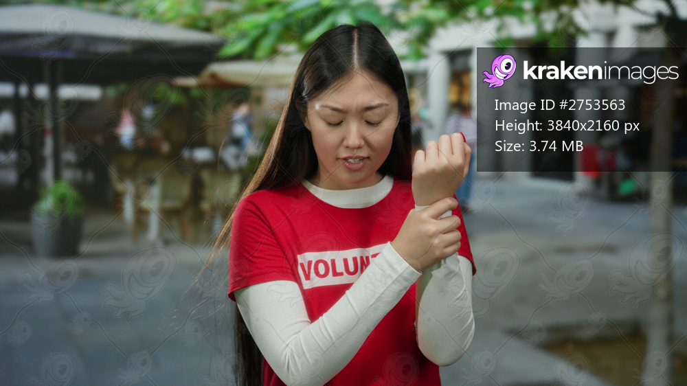 Woman wearing volunteer shirt examines her wrist on urban street with blurred cafes in background, portraying thoughtful expression with long dark hair outdoors in city. - Kraken Images
