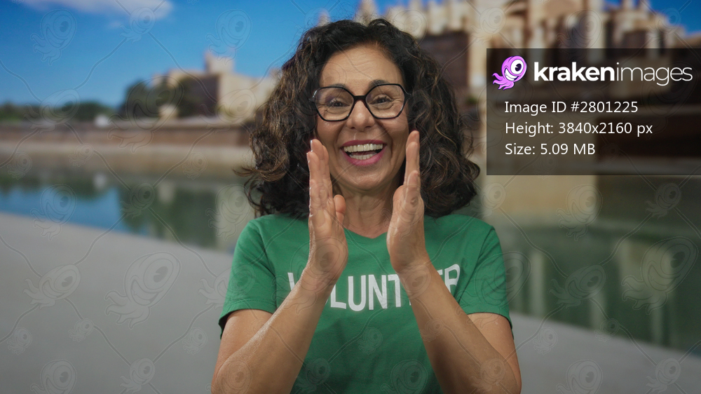 Woman wearing volunteer shirt smiles joyfully in an old town street setting with historic architecture in the background, capturing a sense of community and service. - Kraken Images