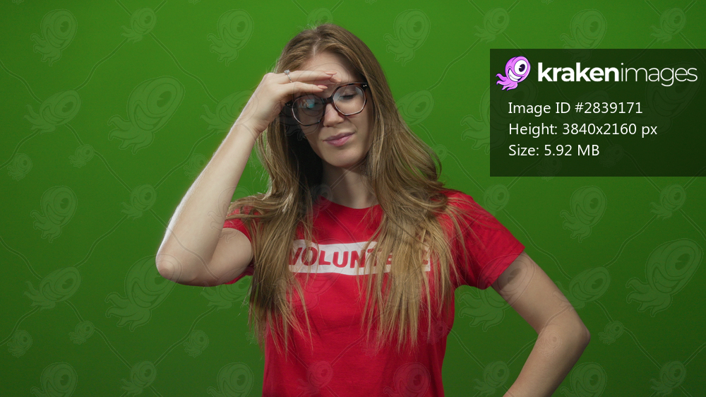 Woman wearing volunteer shirt touching her forehead in green studio; fatigue stress concern exhaustion.