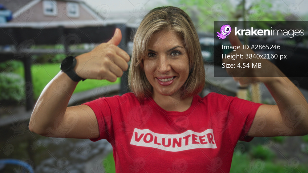 Woman wearing volunteer tshirt shows thumbs up in front of historic building; optimism support solidarity.