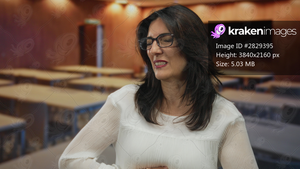 Woman wearing white blouse clutch chest in classroom with desks and chairs; heartattack panic anxiety worry.