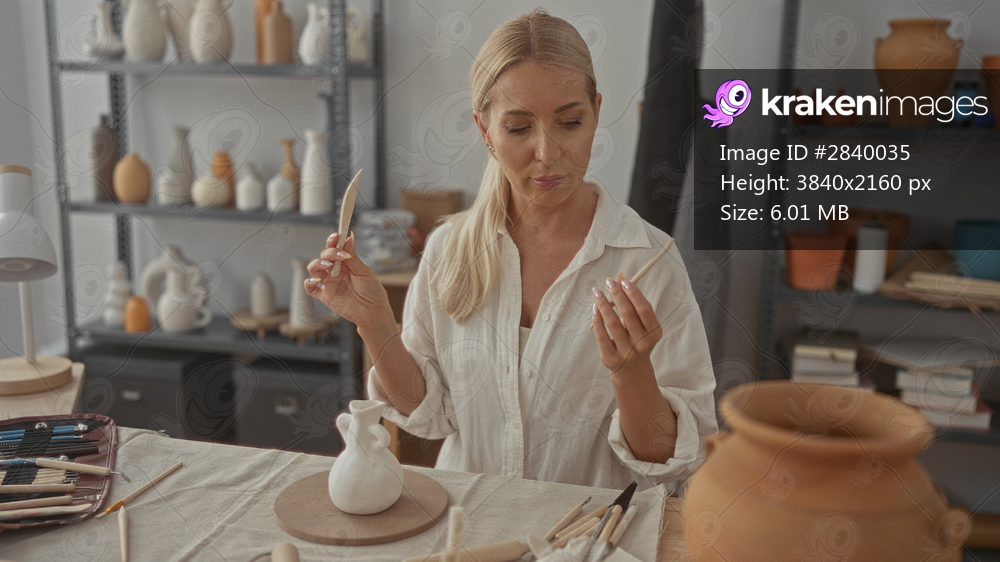 Woman wearing white blouse holding carving tool at pottery table with sculpted vase in studio; serenity.