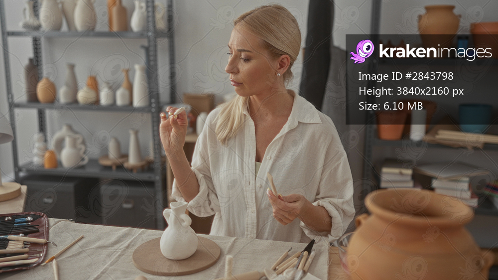 Woman wearing white blouse holding carving tool at pottery table with sculpted vase in studio; serenity.