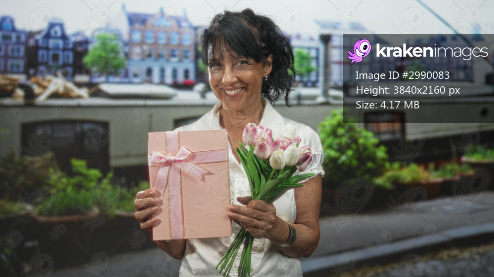 Woman wearing white blouse holding pink gift box and bouquet of tulips, smiling on a street; celebration joy.