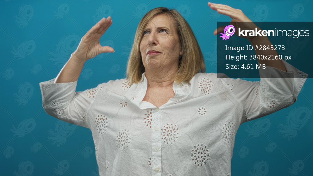 Woman wearing white blouse raises hands in blue studio setting while looking upward; curiosity imagination.
