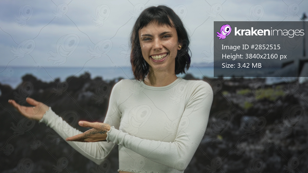 Woman wearing white crop top softly gestures with extended arms and palms up at rocky seaside; invitation reflection serenity openness.