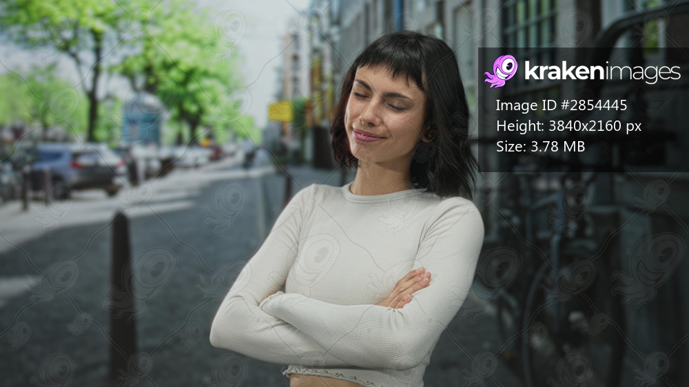 Woman wearing white crop top stands smiling with arms crossed on a bustling city street lined with parked bicycles; confidence.