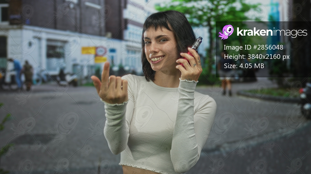 Woman wearing white croptop holds vaporizer and smiles in cobblestone street; carefree confidence.