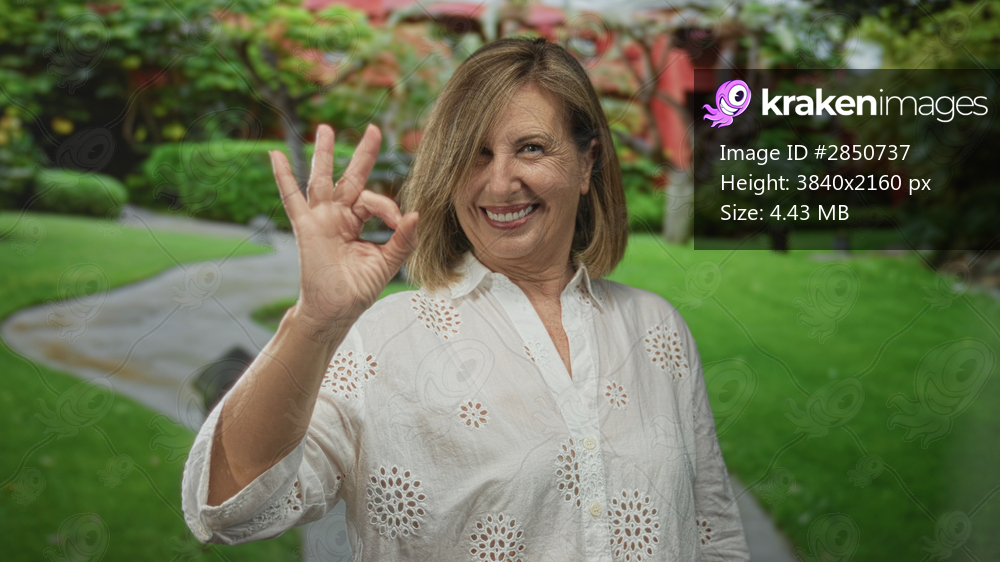 Woman wearing white eyelet blouse holds ok sign with hand on winding green forest trail under soft sunlight; approval.
