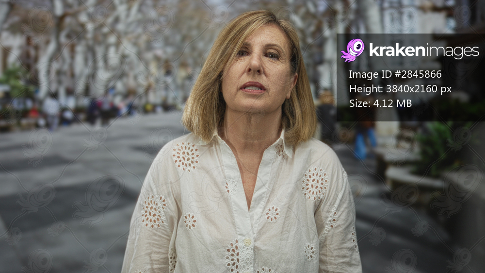 Woman wearing white eyelet shirt looking into camera showing face centered on busy city street; calm reflection.