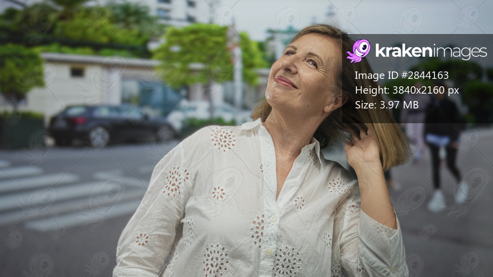 Woman wearing white eyelet shirt smooths hair with hand near nape while gazing upward on busy city street with blurred cars and trees visible; confidence. - Kraken Images