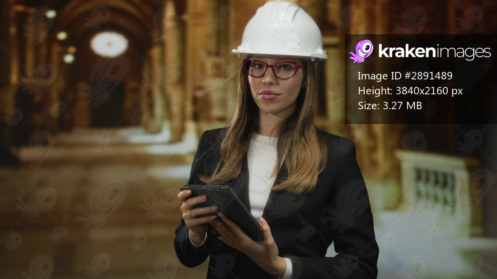 Woman wearing white hardhat and red glasses holding tablet inside building corridor; confidence leadership planning.