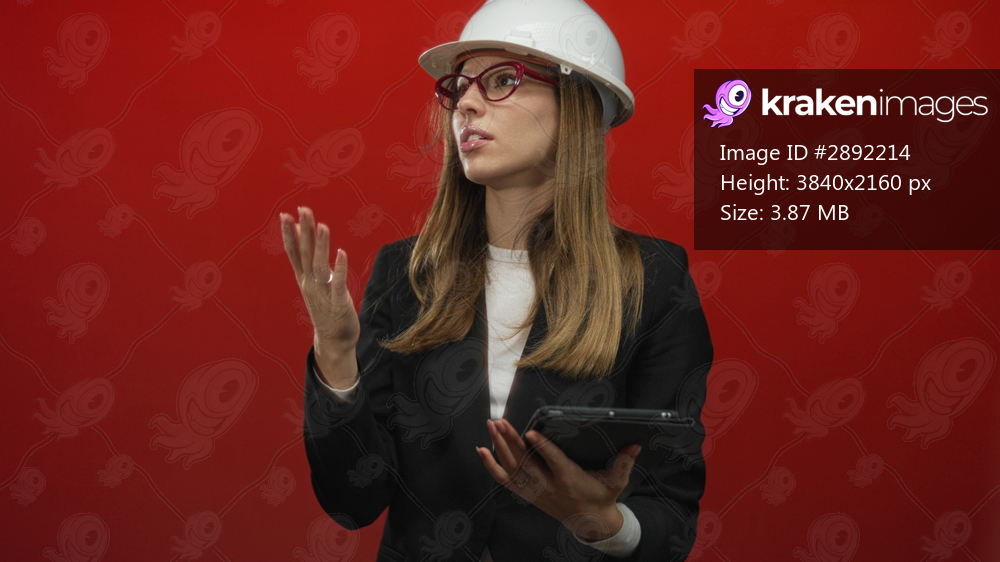 Woman wearing white hardhat and red glasses tapping a black tablet with bare hands against a red studio backdrop; focused leadership.