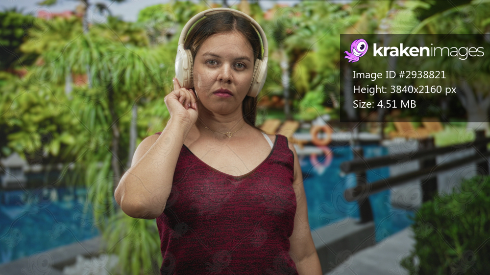 Woman wearing white headphones touches ear with hand while standing by poolside walkway at building entrance near railing; vacation relaxation.