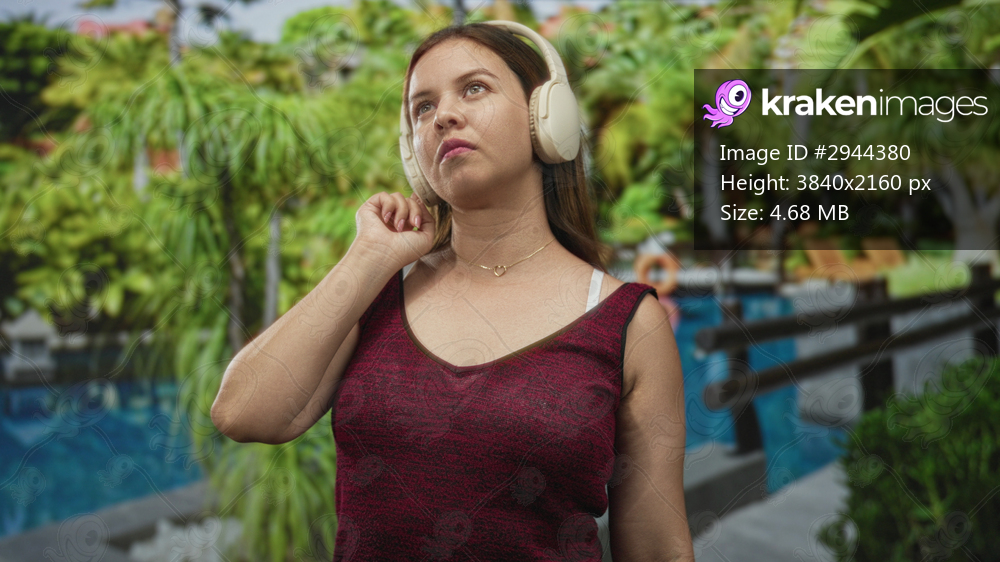 Woman wearing white headphones touches ear with hand while standing by poolside walkway at building entrance near railing; vacation relaxation.