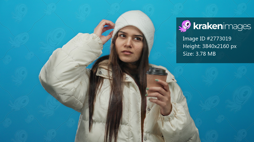 Woman wearing white jacket and beanie holding coffee against bright blue background capturing winter style and thoughtful expression combination