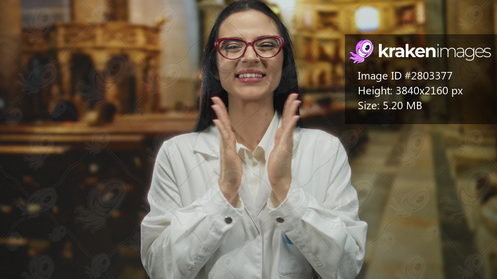 Woman wearing white lab coat with red glasses using expressions in a church setting illustrating a mix of science and spirituality indoors.