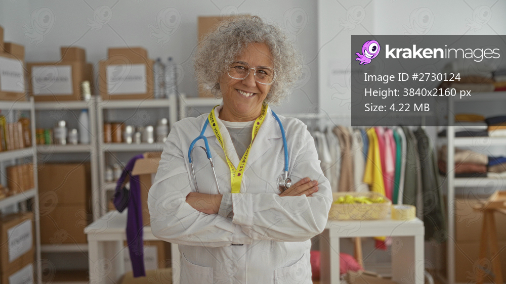 Woman wearing white lab coat with stethoscope and volunteer badge stands confidently in a donation center filled with shelves of supplies and clothing for charity work indoors. - Kraken Images