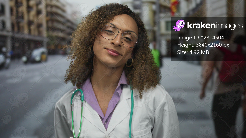 Woman wearing white labcoat and green stethoscope smiles with confident gaze on street; pride empowerment.