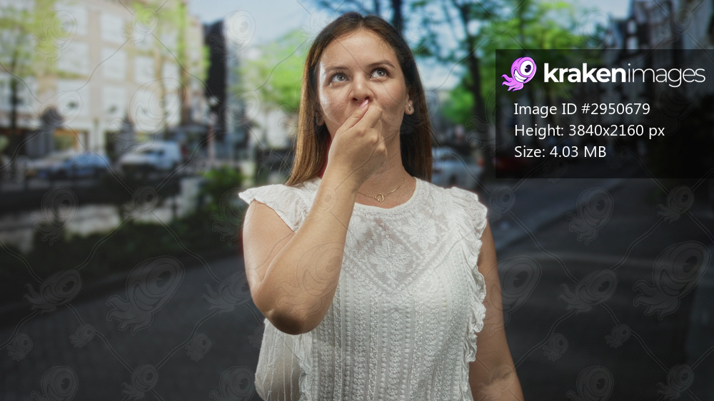 Woman wearing white lace dress with hand at lips, finger to lips for silence on street in amsterdam; playful curiosity.