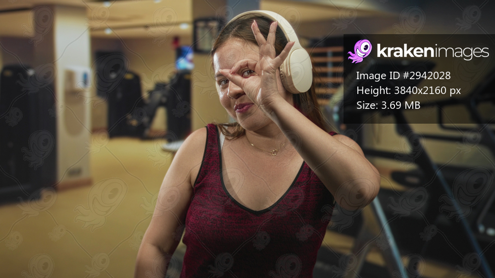 Woman wearing white over ear headphones making ok sign at eye while smiling in gym among treadmills and machines; playful confidence.