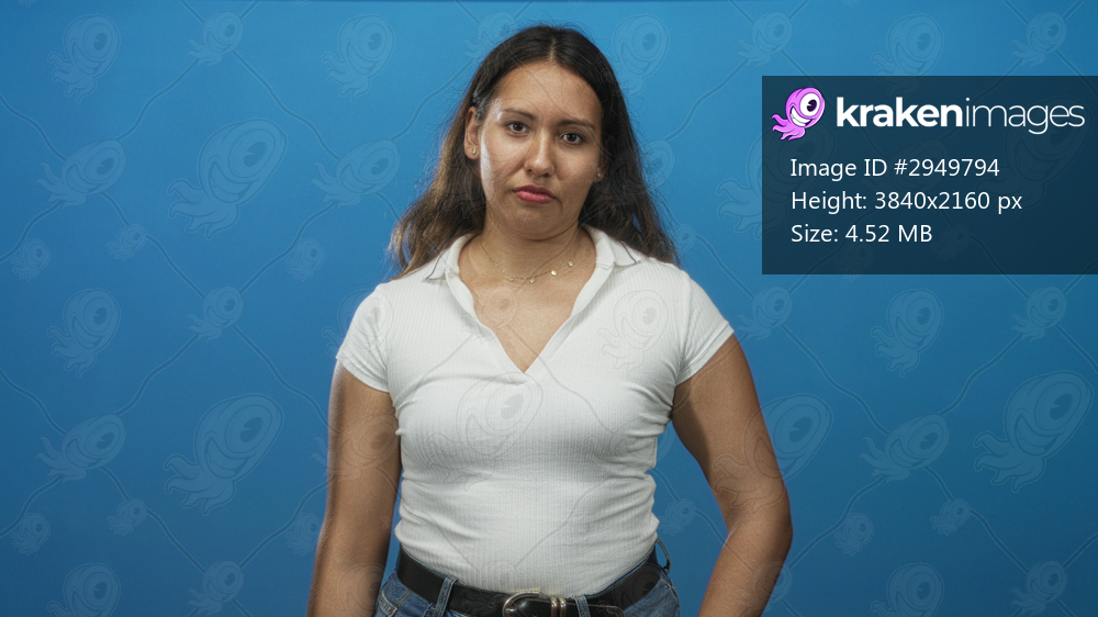 Woman wearing white ribbed top and gold necklace, standing with arms relaxed in blue studio; contemplation.