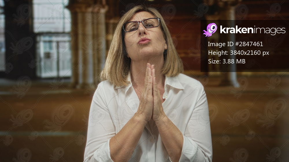 Woman wearing white shirt and glasses with hands clasped in prayer on street at night beneath lit arcade columns; hope.