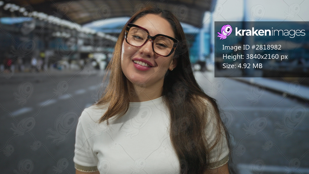 Woman wearing white shirt and glasses presses hands together and smiles under airport terminal canopy; gratitude.
