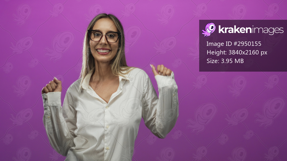 Woman wearing white shirt and glasses smiling with fists raised in purple studio while showing manicured nails and open collar, playful pose; joyful confidence. - Kraken Images