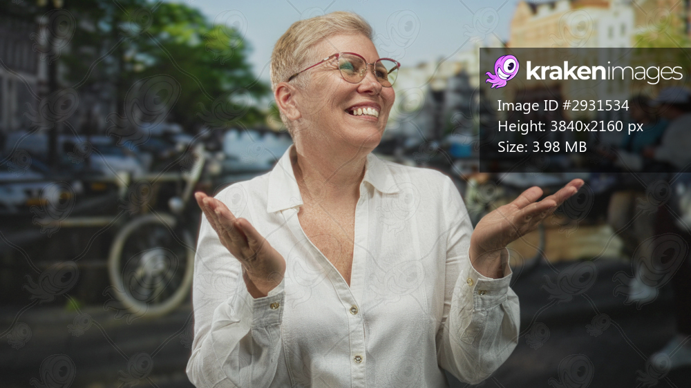 Woman wearing white shirt and glasses smiling with palms up gesture on amsterdam street near canal bridge; happiness travel.