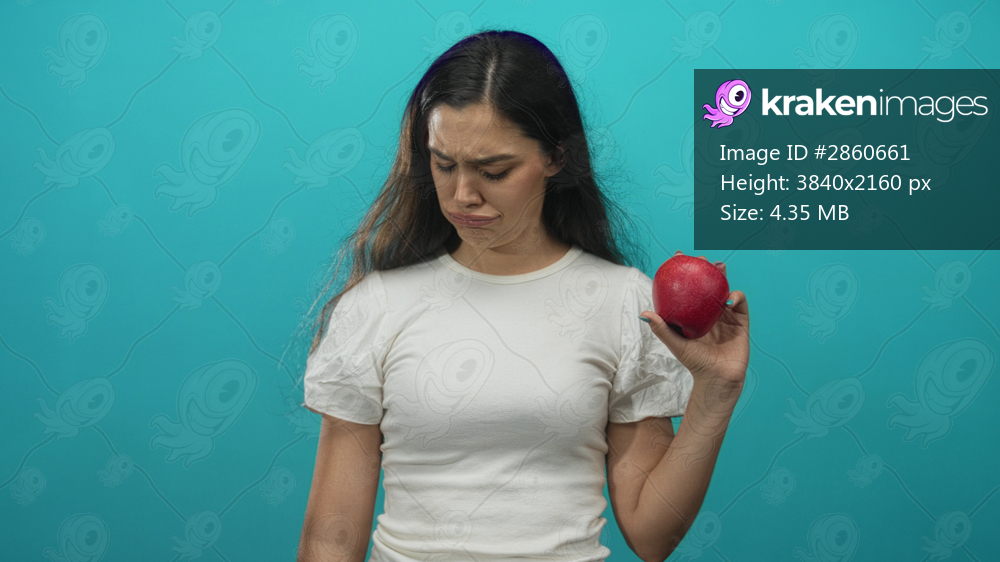 Woman wearing white shirt holding red apple and smiling in turquoise studio; temptation indulgence desire.