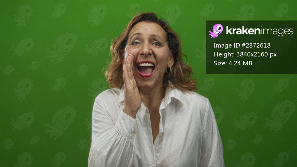 Woman wearing white shirt with open palm at mouth shouting in studio with green wall; cheerful announcement.