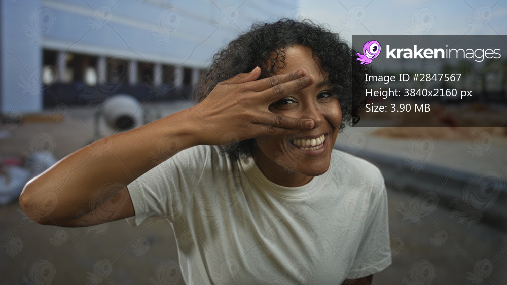 Woman wearing white shirt peeks through fingers with smiling eyes at building under construction in sunshine; joy.
