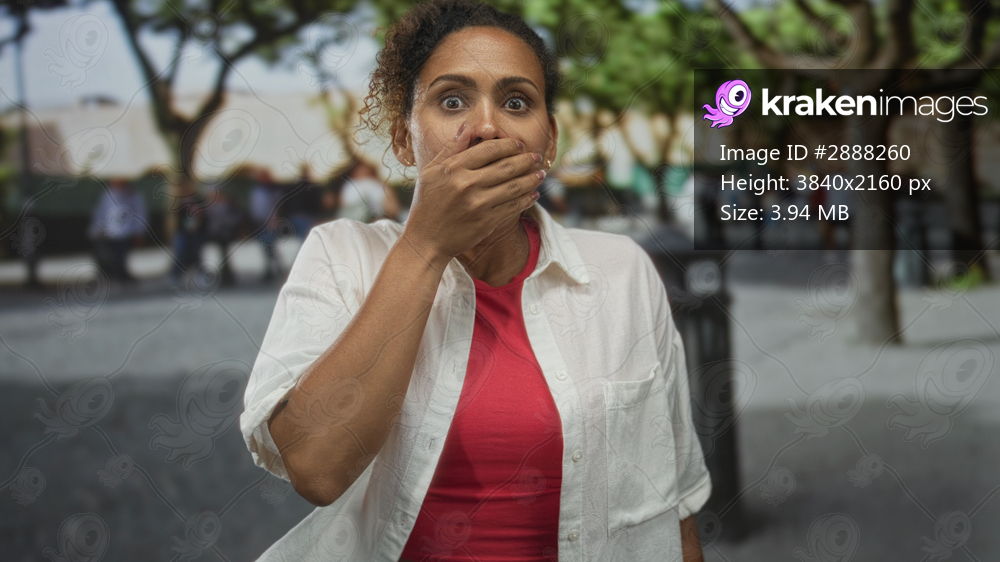 Woman wearing white shirt and red top with hand to mouth for hush and pointing thumb to crowd on street; surprise hush.