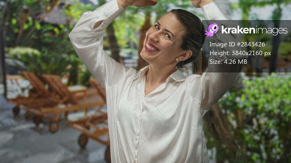 Woman wearing white shirt smiles and raises arms in forest with sunlight filtering through leaves; joy happiness.