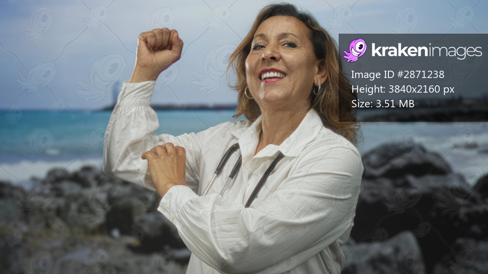 Woman wearing white shirt with stethoscope flexes arms and raises fists on rocky seaside coast; confidence.
